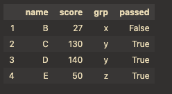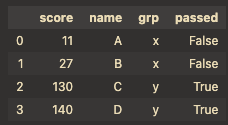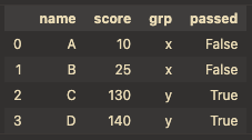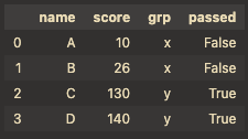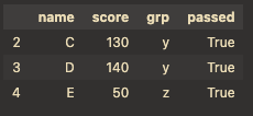 &,|를 사용해야함: df[(df["grp"]=="x")& (df["score"]>20)]