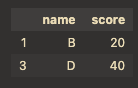 df.loc[mask, ["name", "score"]] # 'score'>=20 조건 만족 row × 'name','score' column 선택