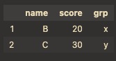 df.loc[1:2, "name":"grp"] # 라벨 1~2 row × 'name'~'grp' column 선택