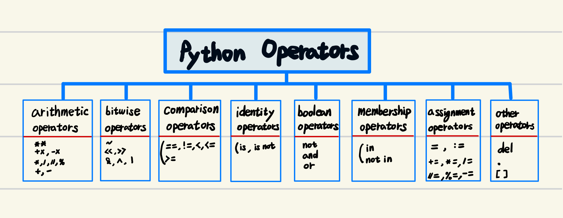 and: and 연산자. (binary op.) : C언어 등에선&&에 해당.or: or 연산자. (binary op.) :||에 해당.not: not 연산자. (unary operator로 operand가 하나임.) :!에 해당.