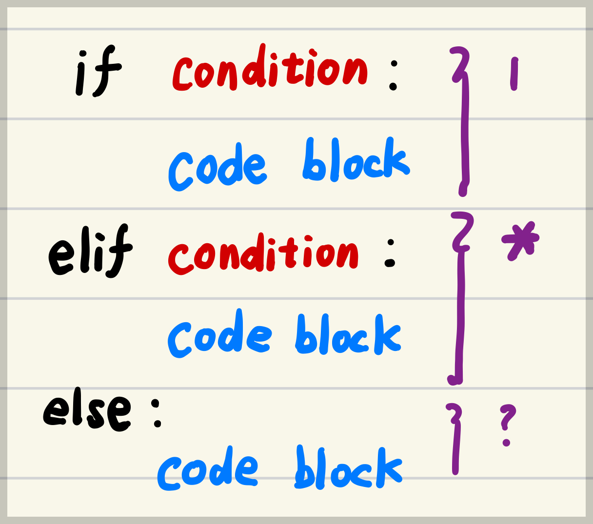 첫 라인의 condition이True인 경우if_block의 statements들이 수행됨.elifstatement는 위의 예에서 셋째와 넷째 라인에 해당한다. ( elif = else + if )- 항상 이전에