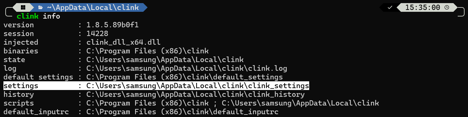 참고로, 관련된 설정 파일은 clink info 를 수행하여 나온 정보에서 settings 에 있는 파일임.