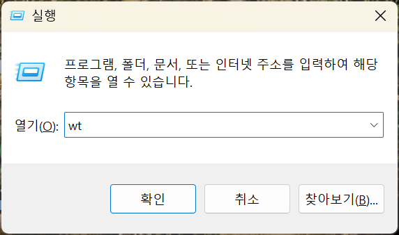 이후로는 윈도우키+r 을 누르고 wt 입력하고 Windows Terminal 을 실행할 수 있음