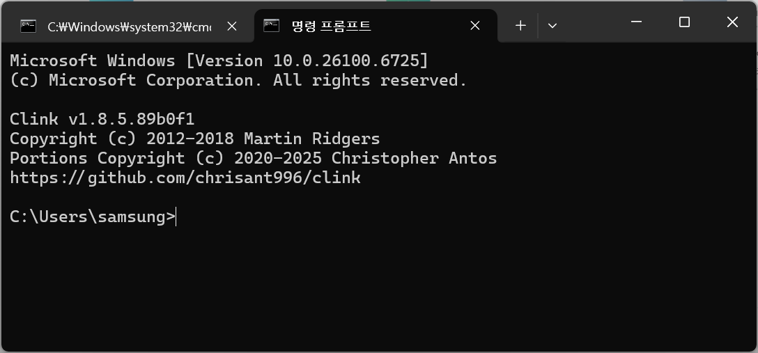 이후 윈도우터미널에서 새 탭으로 cmd를 실행하면 다음과 같이 CLINK가 수행됨을 확인 가능함.