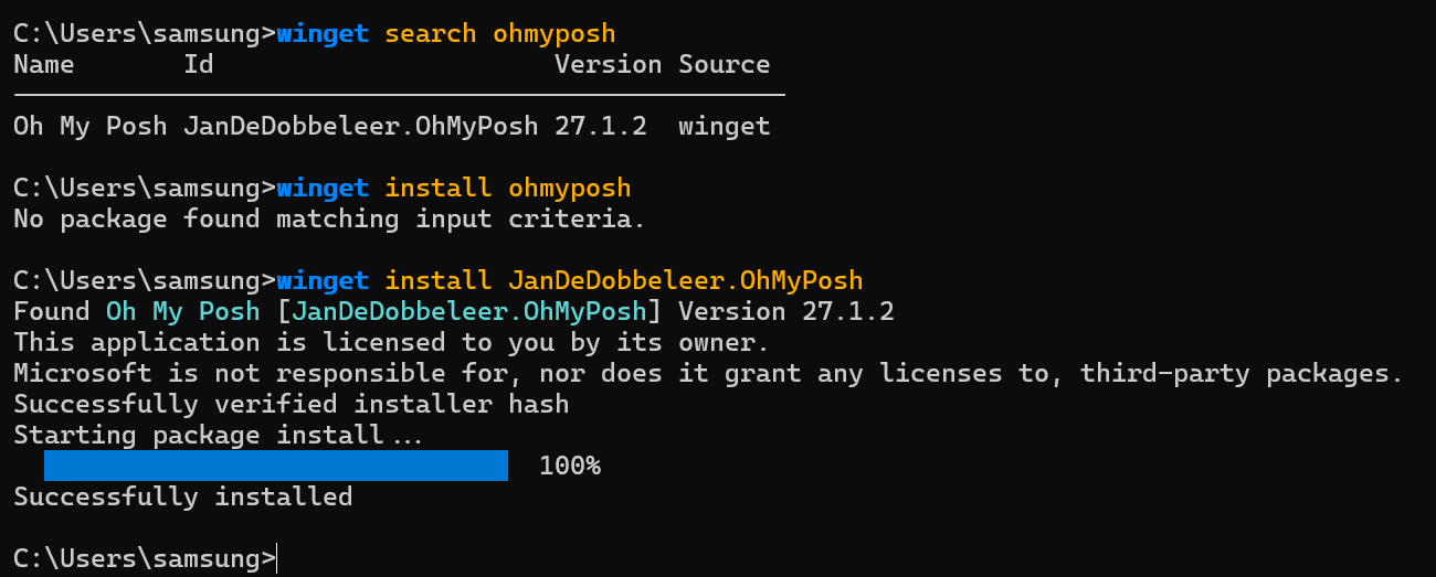 winget으로 간단히 oh-my-posh 를 다음과 같이 설치할 수 있음.