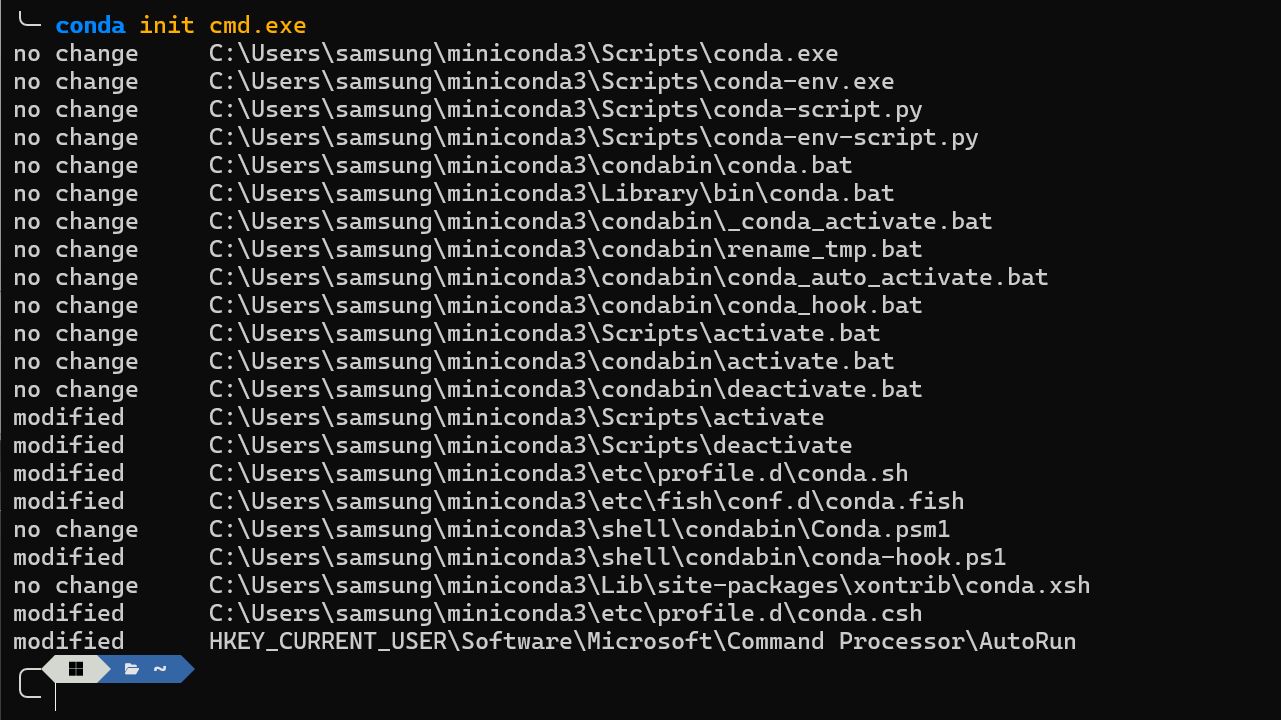 conda 를 설치하고 나서 Anaconda Prompt 에서 conda init cmd.exe 실행하면