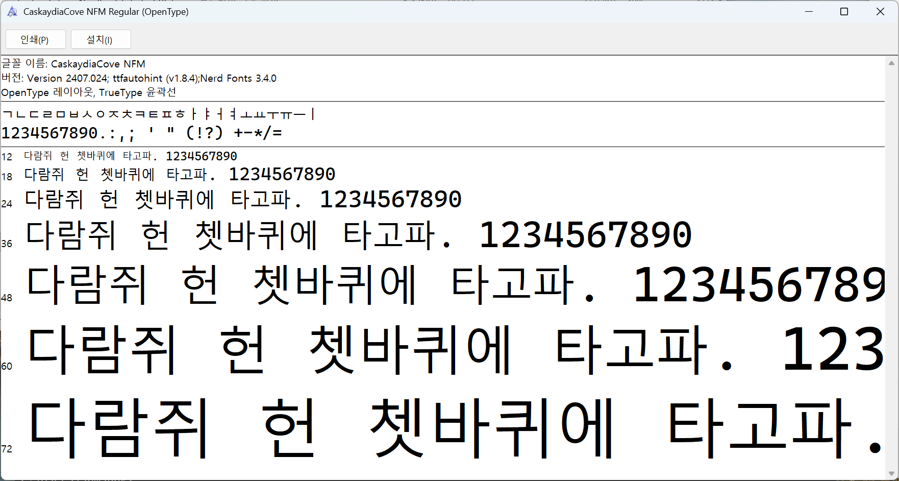 이 중 CaskaydiaCoveNerdFontMono-Regular.ttf 를 더블클릭하여 열면 다음의 창이 뜸.