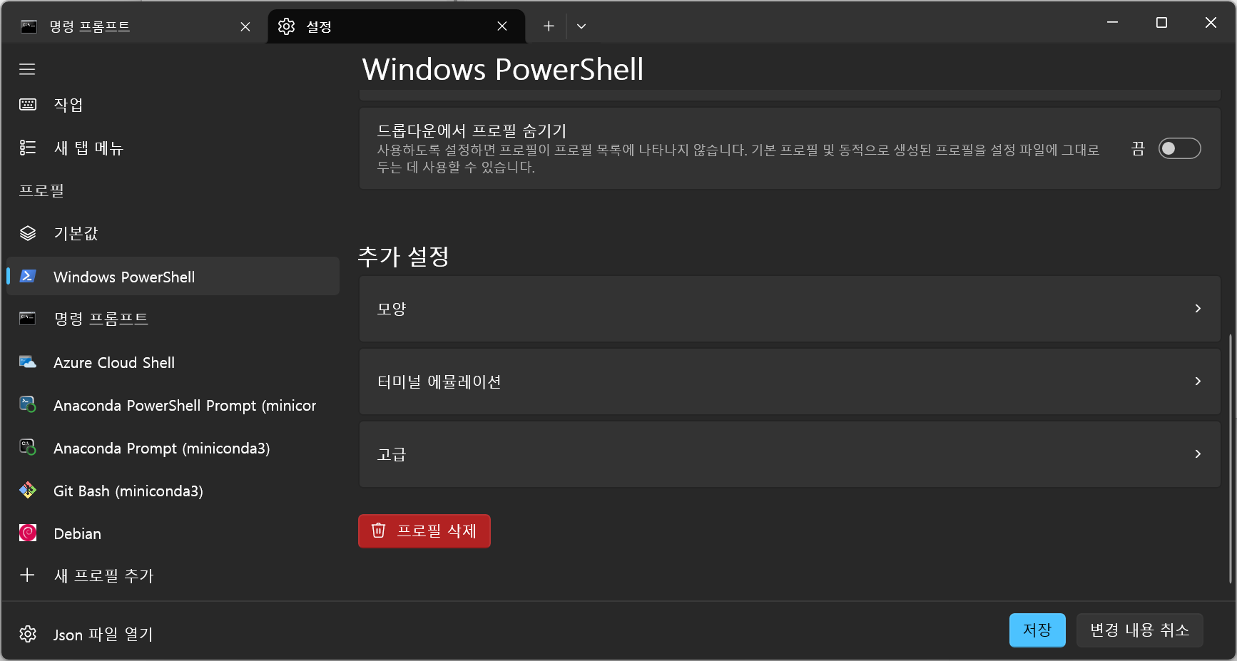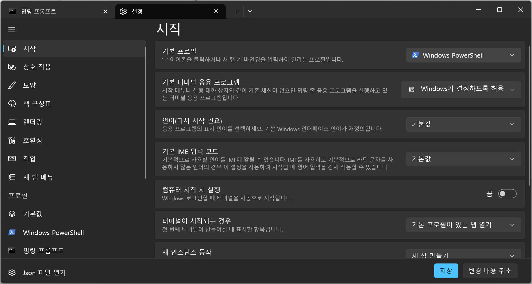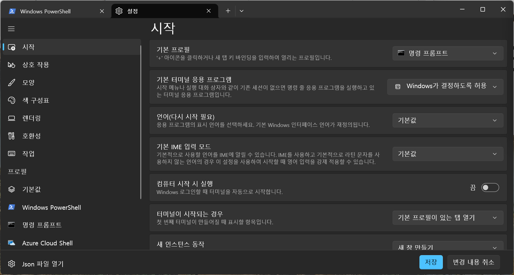 아래의 저장을 클릭하고 나서 새로운 탭으로 Windows PowerShell로 열면 해당 설정이 적용됨.