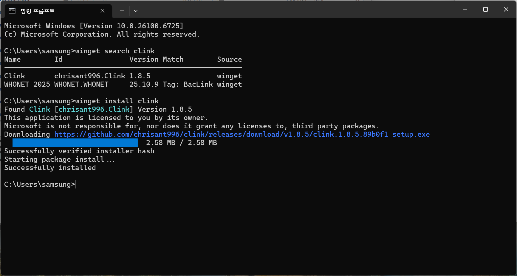 winget 으로 clink를 설치하는 화면은 다음과 같음: