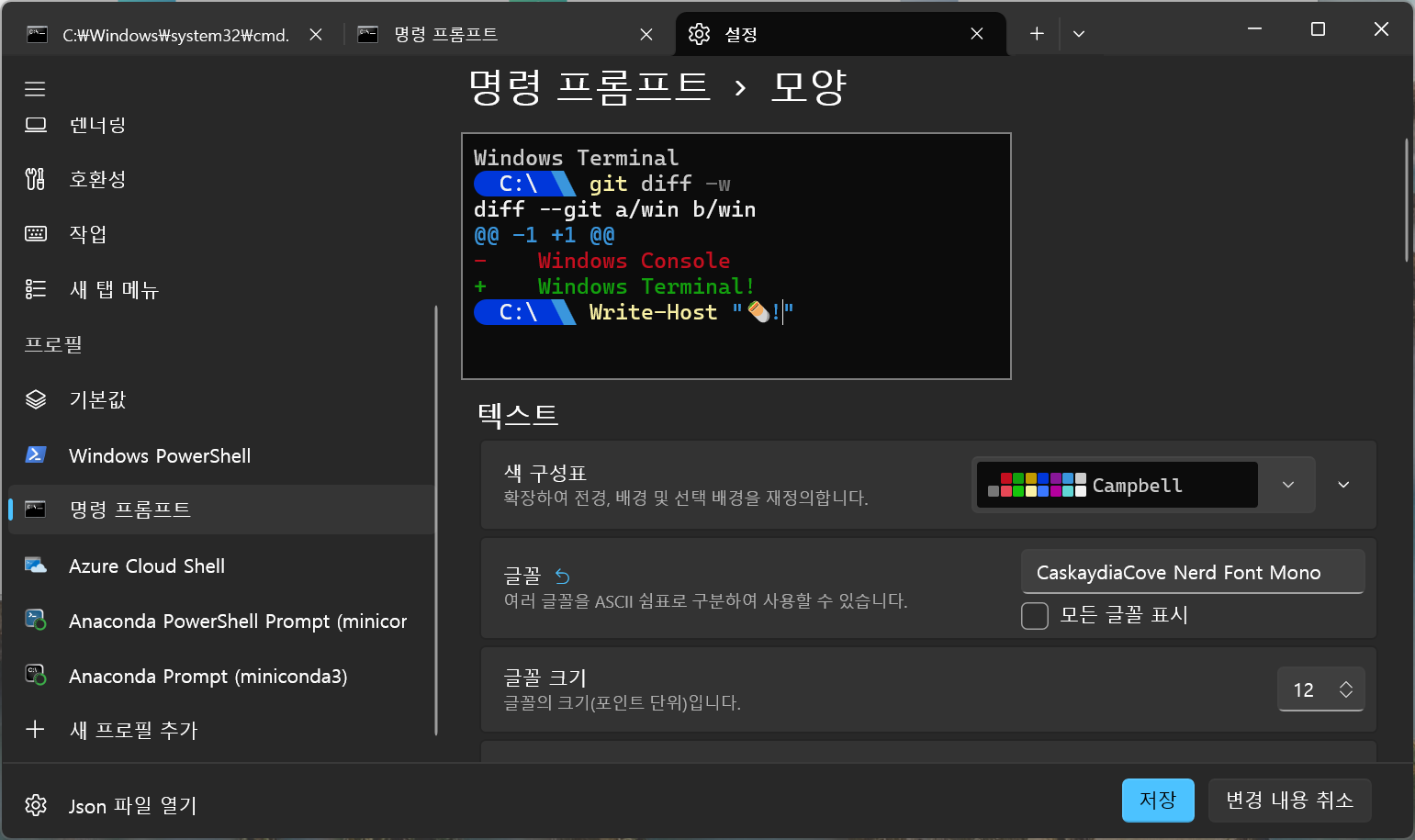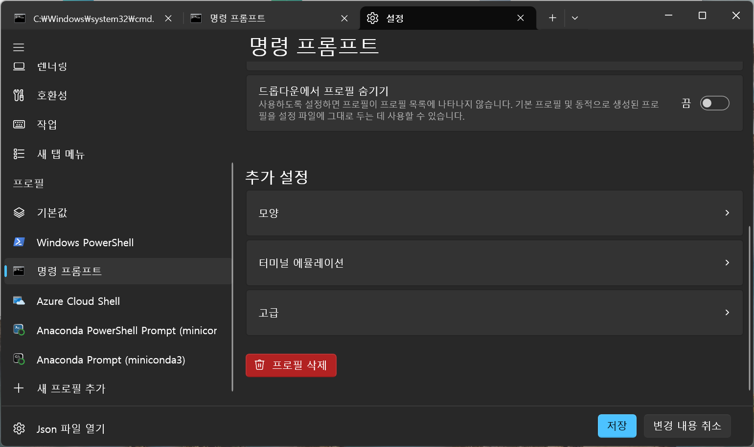 Ctrl+, 로 설정을 열고 오른쪽 패널에서 아래쪽 "프로필" 밑의 "명령 프롬프트" 를 선택하면 왼쪽 패널이 명령 프롬프트 설정이 됨.
