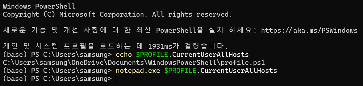Windows PowerShell에서 사용하려면 Windows PowerShell에 다음과 같이 현재 사용자의 profile용 ps1파일을 열어서 편집한다.