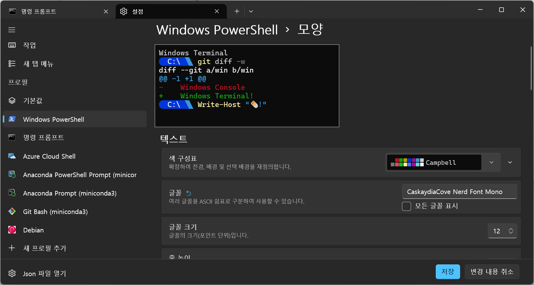 이후, Windows Terminal 의 폰트를 CaskaydiaCoveNerdFont로 설정한다.