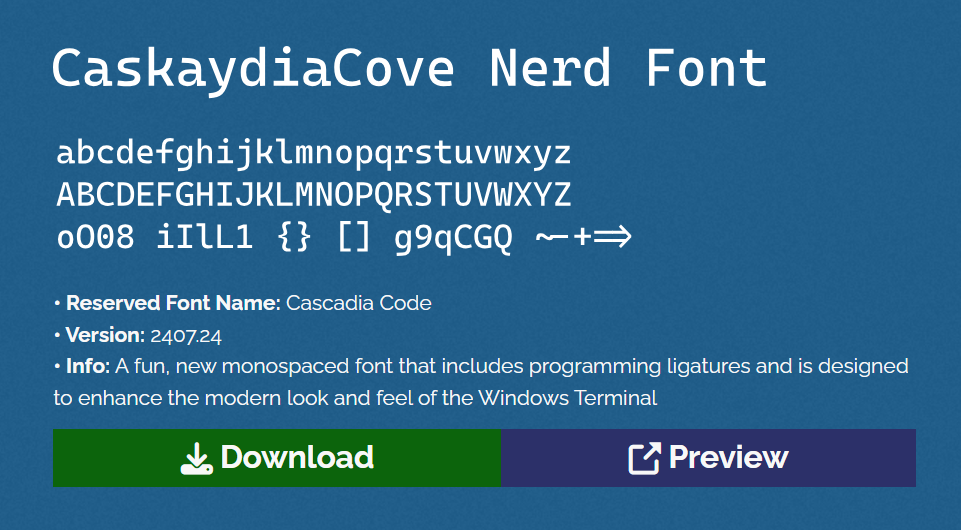 여러 폰트 중에서 CaskaydiaCove Nerd Font 로 이동하여 다운로드