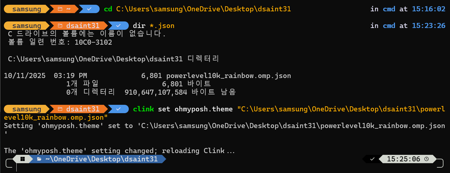 앞서 다운로드 받은 파일의 path를 clink set ohmyposh.them 에 인자로 넘겨줌.
