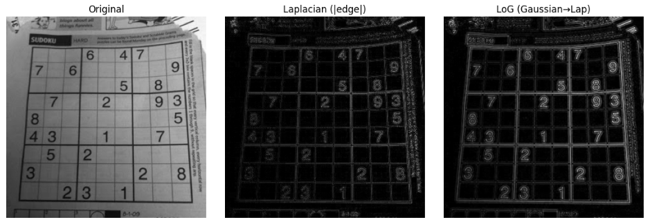 axes[2].imshow(edge_log, cmap='gray'); axes[2].set_title("LoG (Gaussian→Lap)"); axes[2].axis('off')
