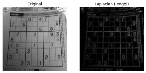 axes[1].imshow(edge_lap_abs, cmap='gray'); axes[1].set_title("Laplacian (|edge|)"); axes[1].axis('off')