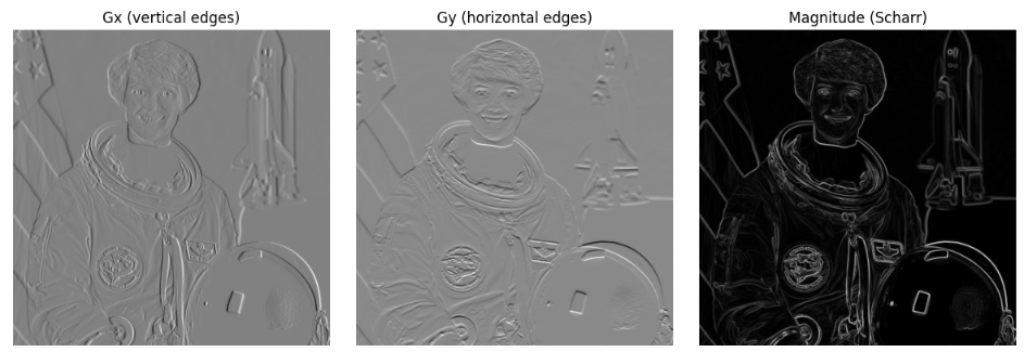 Scharr은 특히 정밀한 방향 정보가 필요한 경우 (예: 에지 방향 기반 특징, Optical Flow, Gradient Orientation Histogram 등) Sobel보다 더 적합함.