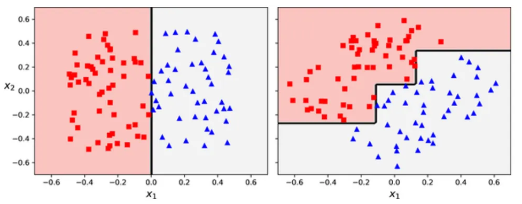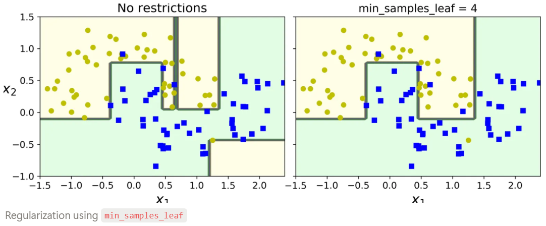 다음은 CART가 restriction이 없는 경우와 min_samples_leaf 를 통한 regularization을 한 경우 결과를 보여줌.