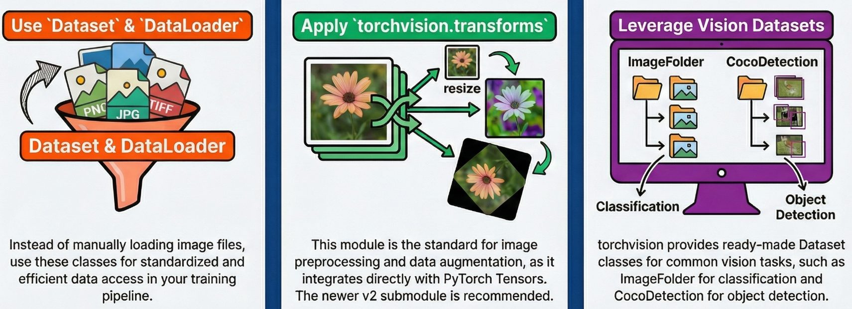 torch를 기반으로 한 기계학습 및 딥러닝 학습 파이프라인에서는, 기존의 OpenCV, Pillow, scikit-image와 같은 범용 영상 처리 라이브러리보다 torchvision.transforms 모듈을 사용하는 것이 일반적이다. 이는