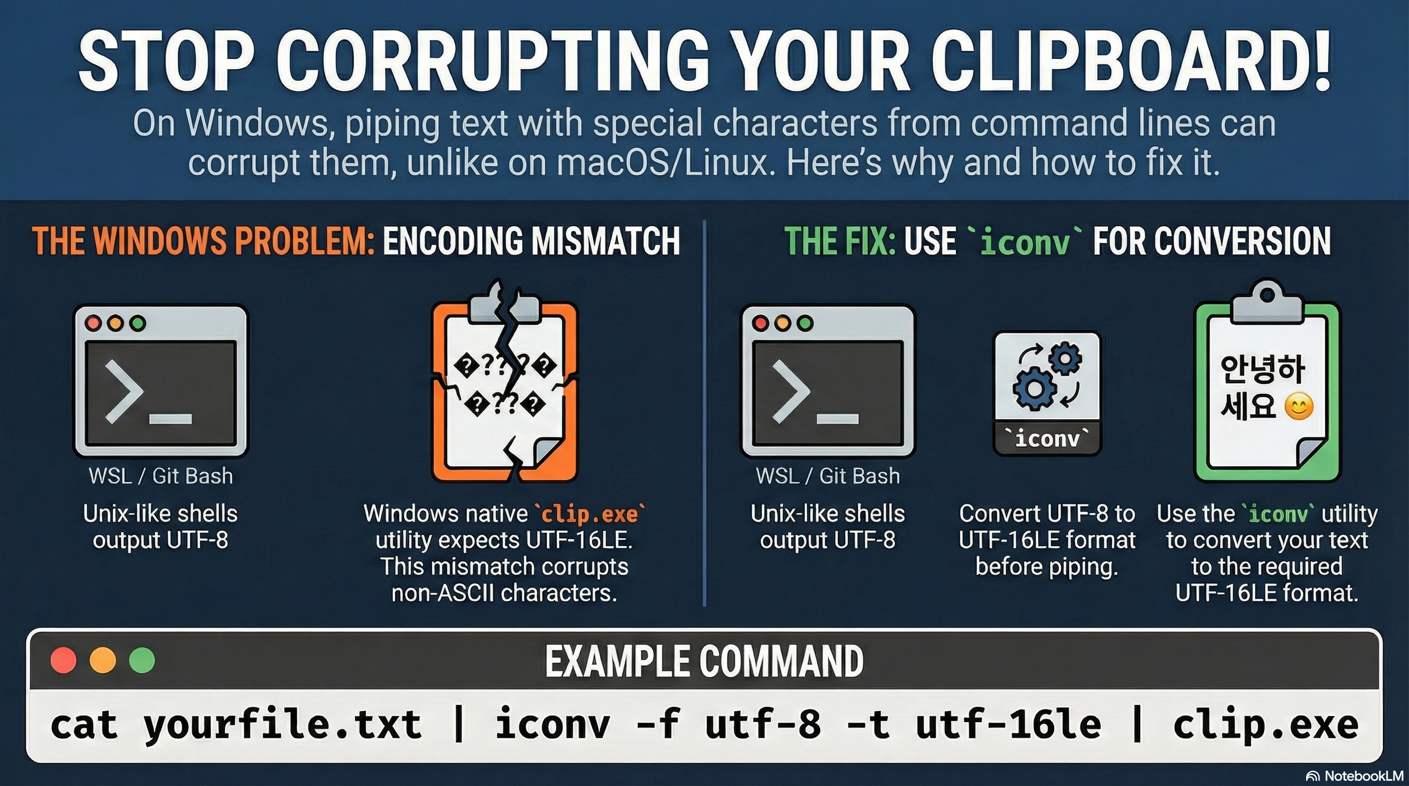 clip.exe가CF_UNICODETEXT형식(UTF-16 Little Endian,utf-16le)로 인코딩을 가정하고 있기 때문임.
