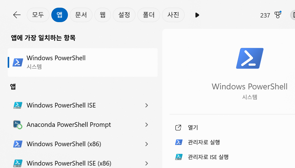 PowerShell을 윈도우의 검색에 입력하면 다음이 보임 (앱 한정시):