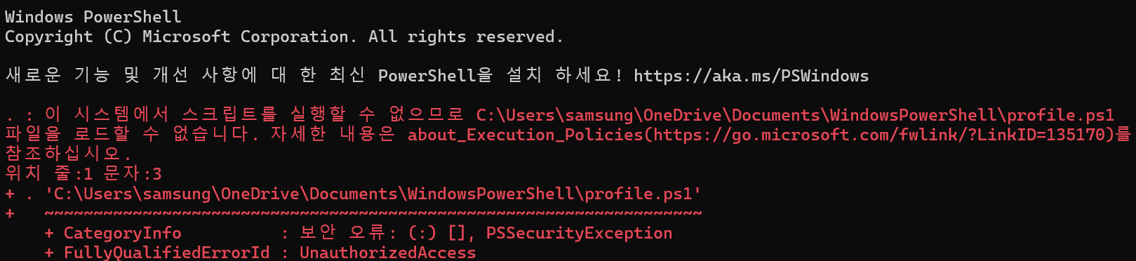 이로 인해 PowerShell profile이 자동 실행되지 않는다는 메시지가 표시될 수 있다.