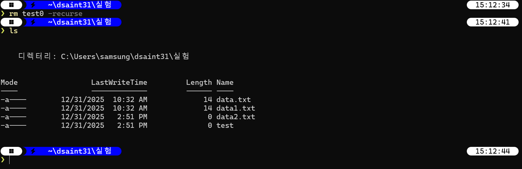 만약, 지우고자 하는 directory 안에 파일이 있는 경우엔 하위항목을 지울지 등에 대해 물어본다: 이게 싫으면 -recurse 옵션을 이용.