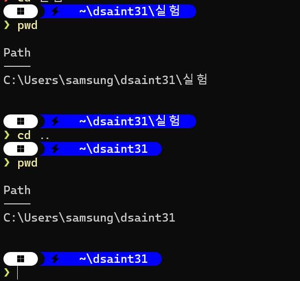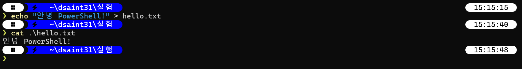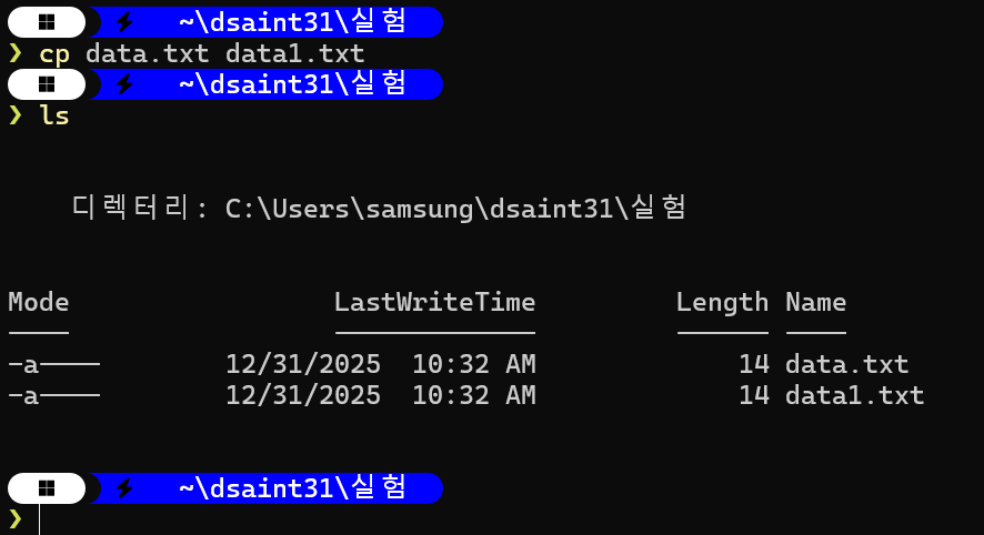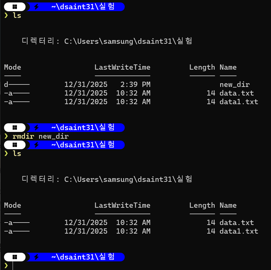 존재하지 않는 상위 디렉토리까지 함께 생성할 수 있음. - 반면 PowerShell에서는 별도의 -p 옵션을 지정하지 않아도,