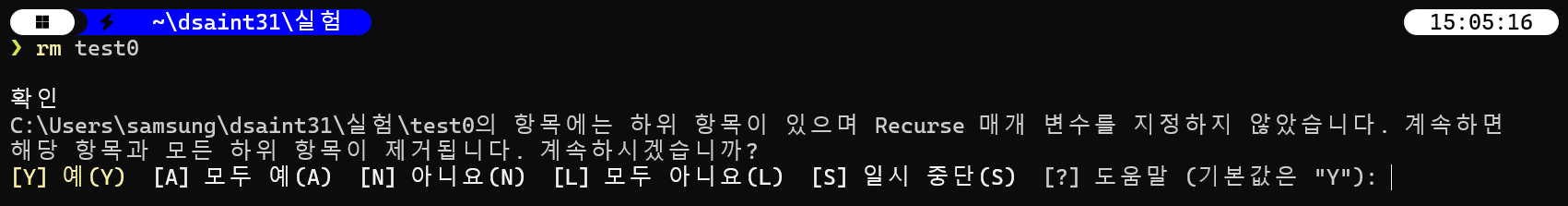 - Windows PowerShell에선 디렉토리를 제거할 경우, 하위항목을 지울지를 물어봄.