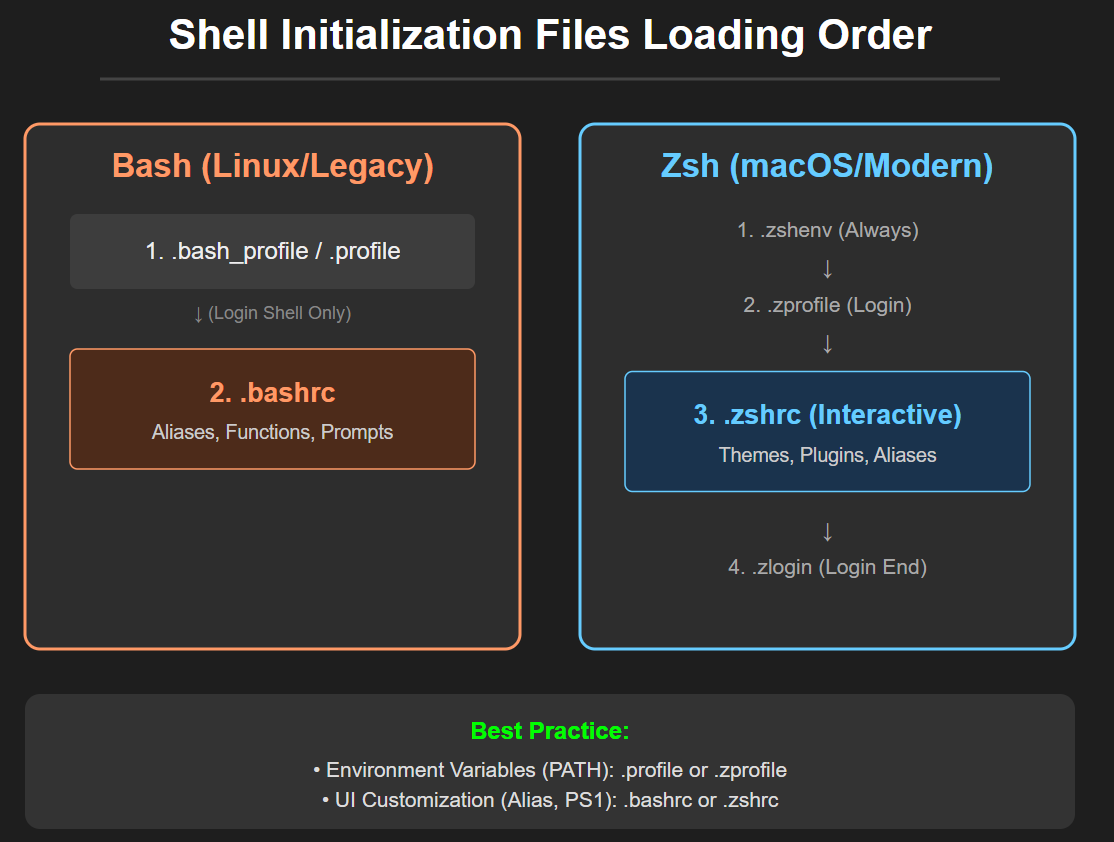 .zshenv:- 역할: 쉘 실행 시 무조건 가장 먼저 실행.