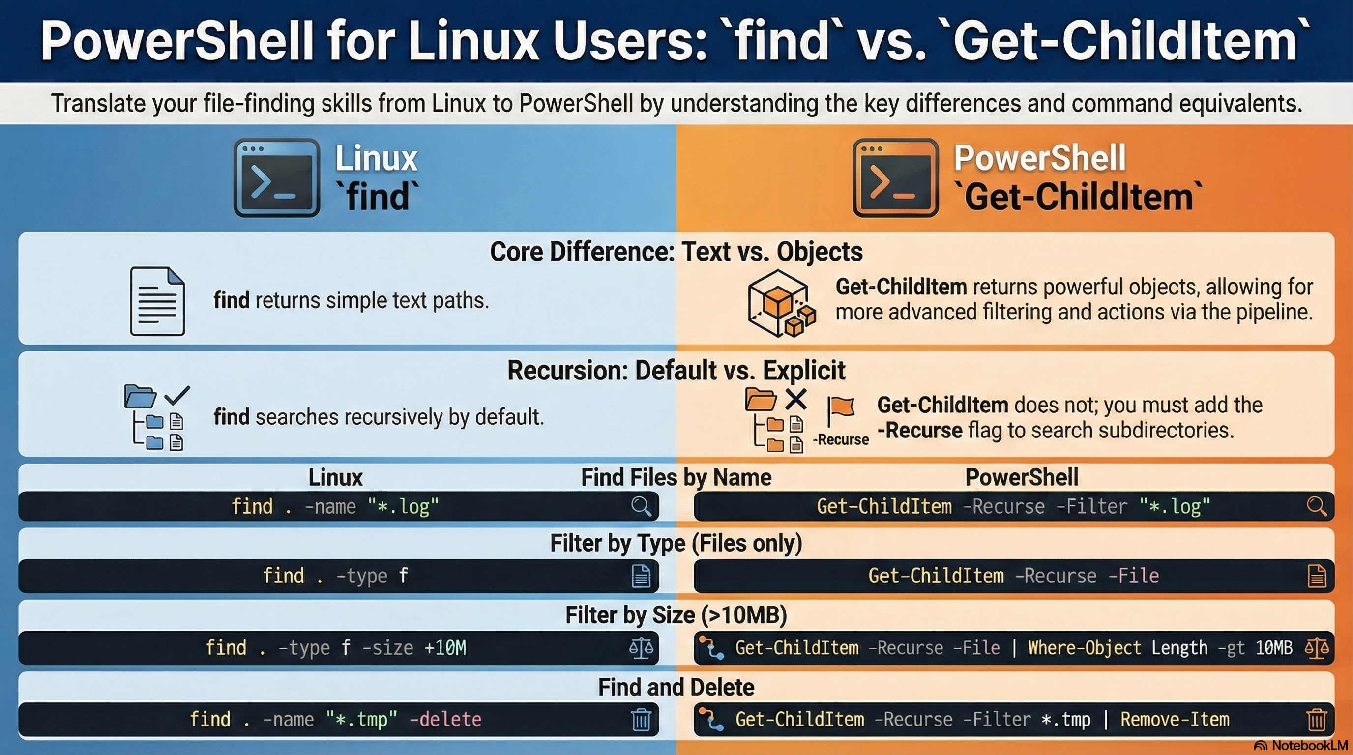 - PowerShell에서 파일 시스템을 재귀적으로 탐색하며 조건에 맞는 항목을 찾는(find) 핵심 cmdlet.