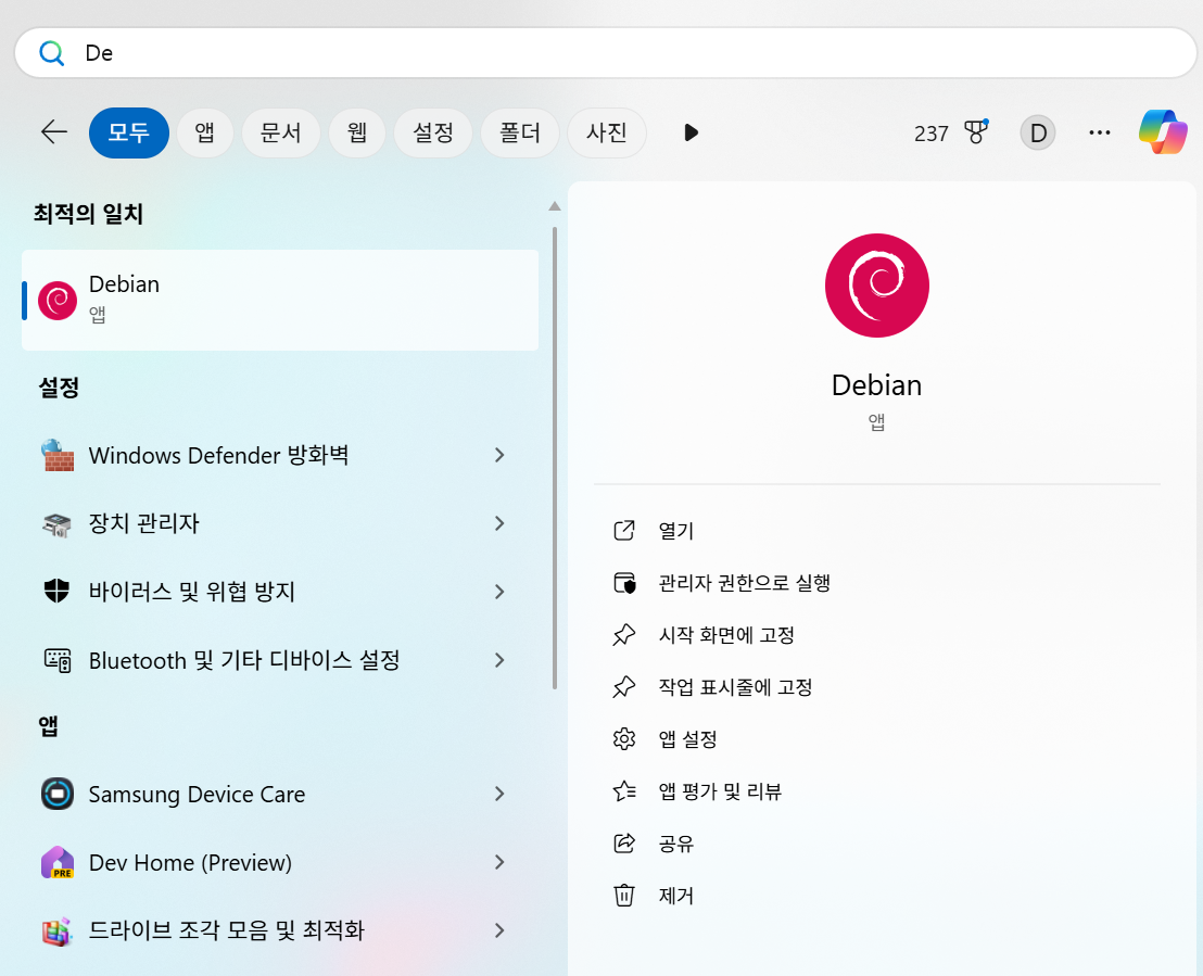 검색에서 Debian 을 찾으면 winget 을 통해 설치된 앱이 보임: