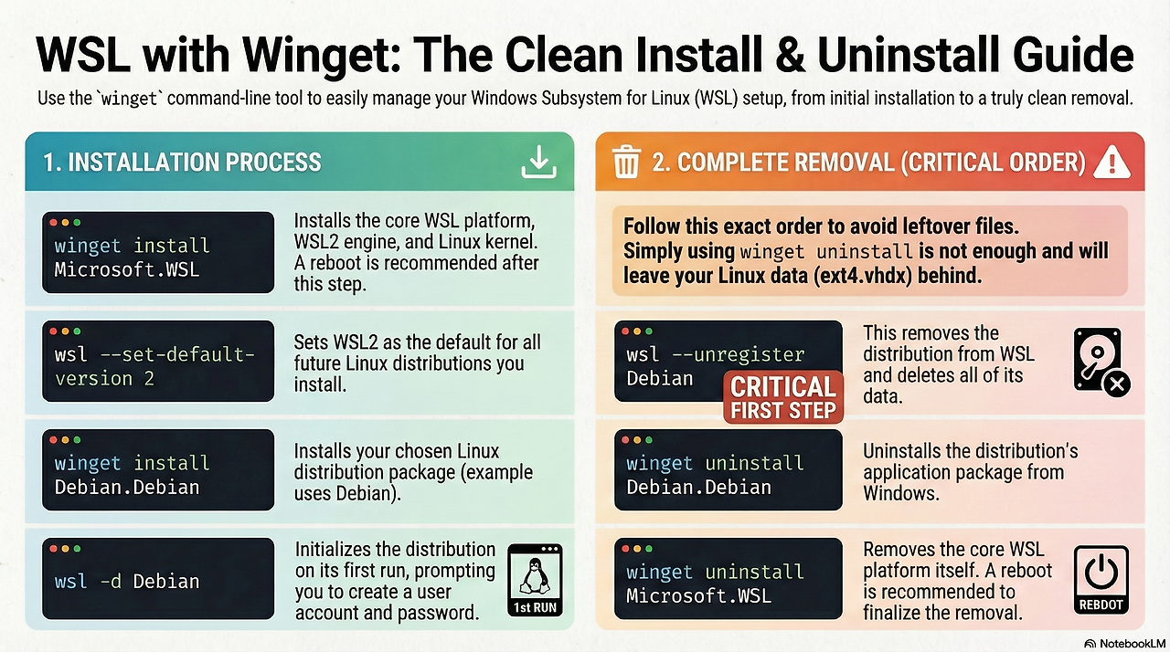 이 문서는 winget 기반으로 WSL + Debian을 설치하고 WSL2로 사용한 뒤, 다시 완전히 제거하는 절차를 정리함.