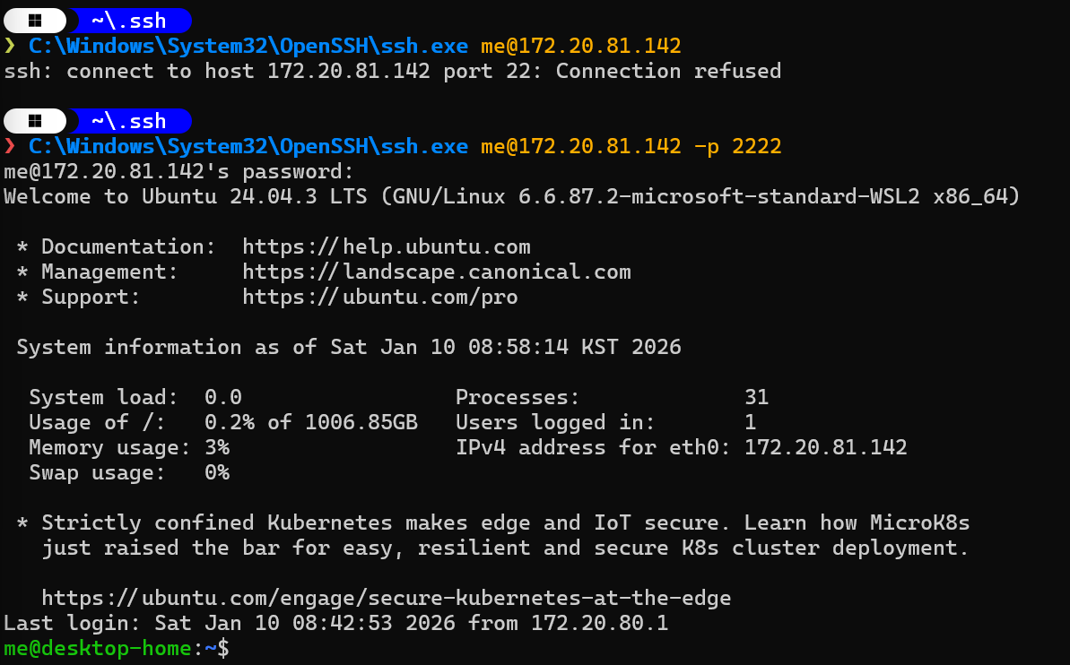- 172.20.81.142:2222 = 상대방 주소로 WSL의 ssh서버가 동작하는 VM의 IP 의 2222번 포트 가 상대방임을 의미.