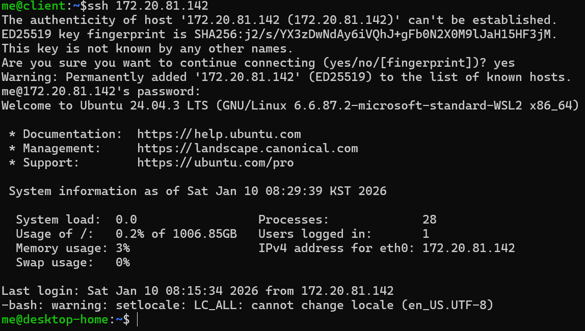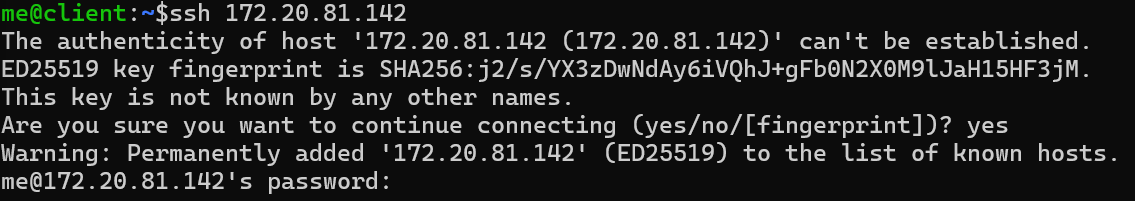 yes 를 입력하고 엔터를 치면, 현재 계정 me 로 ssh서버에 접속을 시도하고 암호를 물어본다.