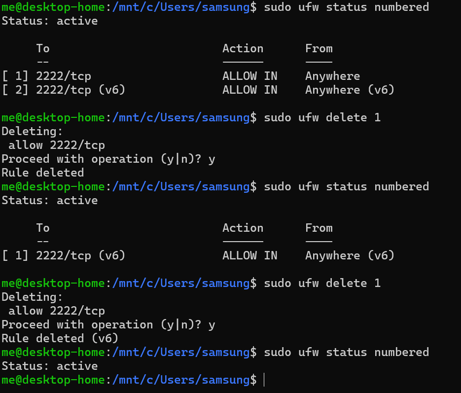 허용한 룰(2222/tcp 로 들어오는 것을 허용한 것)을 제거하려면,