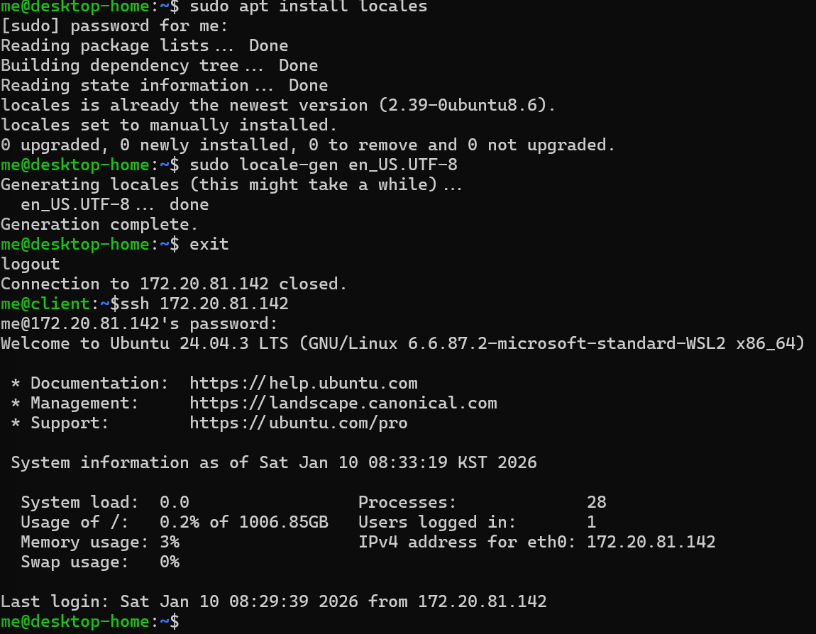 - WSL의 Ubuntu는 C.UTF-8 이 기본이고 en_US.UTF-8이 생성이 안된 상태임.