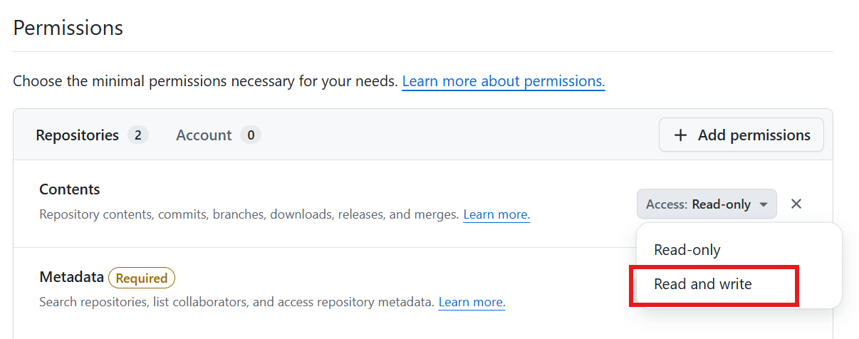 아래의 Permissions 에서 필요한 최소권한을 주기 위해 Add permissions 를 클릭하고 보이는 여러 권한 중에서 Content를 선