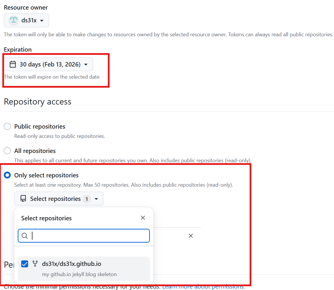 이후 Expiration Date (기본으로 30일) 를 정하고, 대상으로할 repository를 선택.