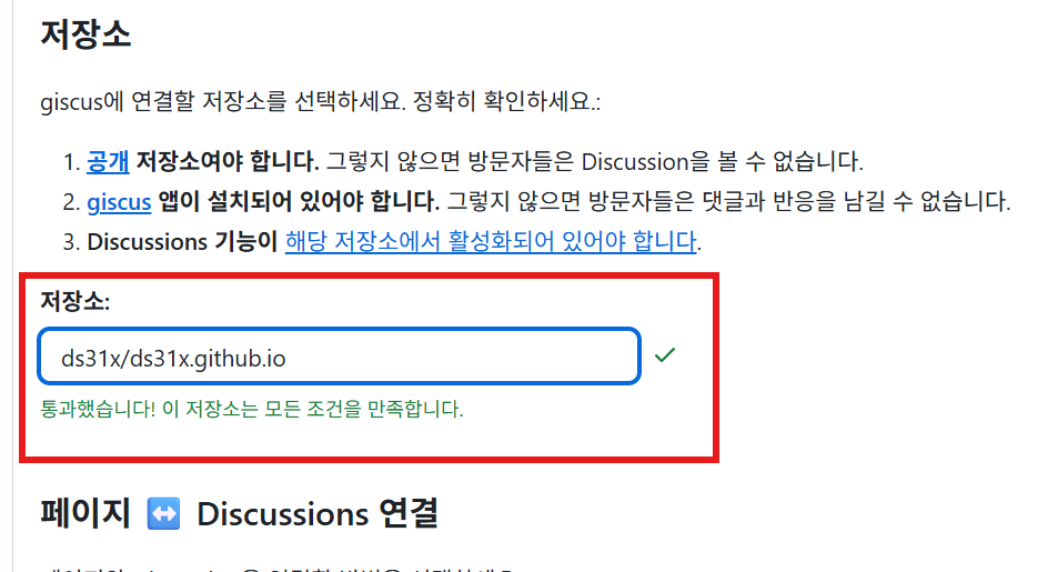 아래로 내리면 페이지와 Discussions 연결 방법을 설정하는 부분이 나옴.