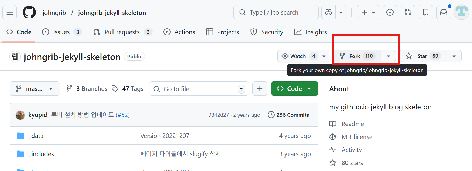 - fork로 만들어질 저장소 이름을 가급적 <본인계정명>.github.io 로 해야함
