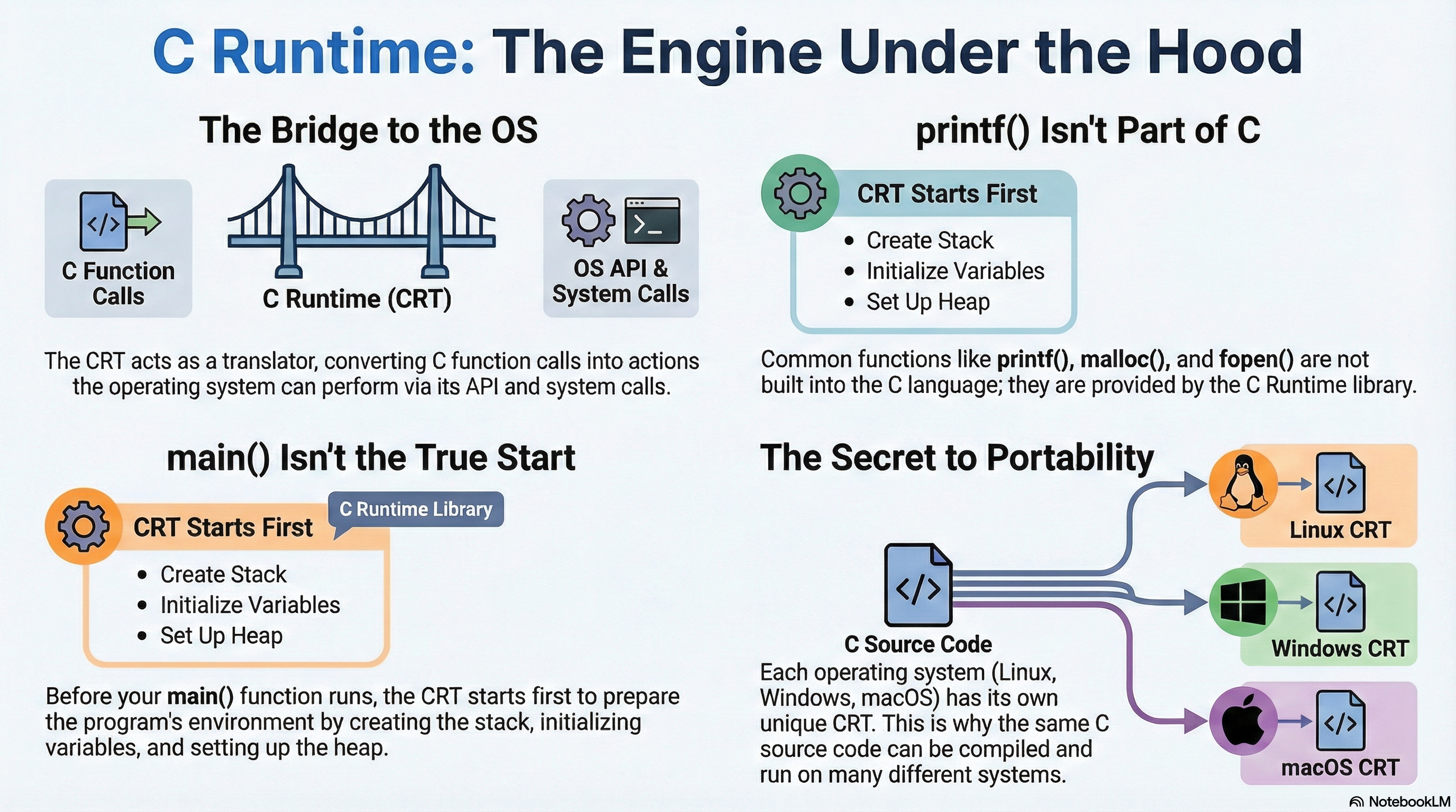 - OS 와의 모든 상호작용은 C Runtime을 통해 이루어짐.