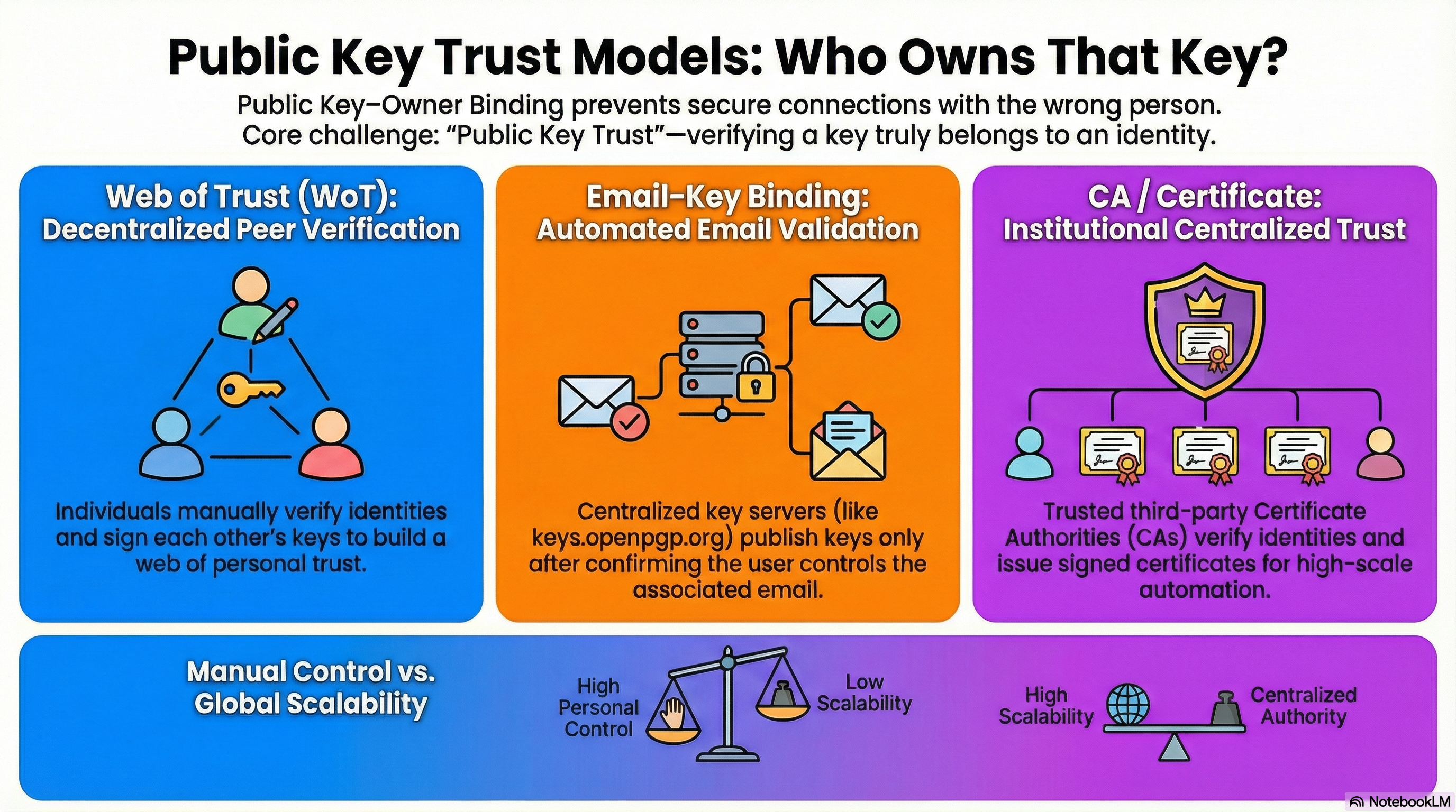- 키서버가 email과 public key의 대응 관계를 검증하며, 키서버에 공개된 public key의 사용은 해당 email–key 바인딩을 신뢰함을 의미한다.