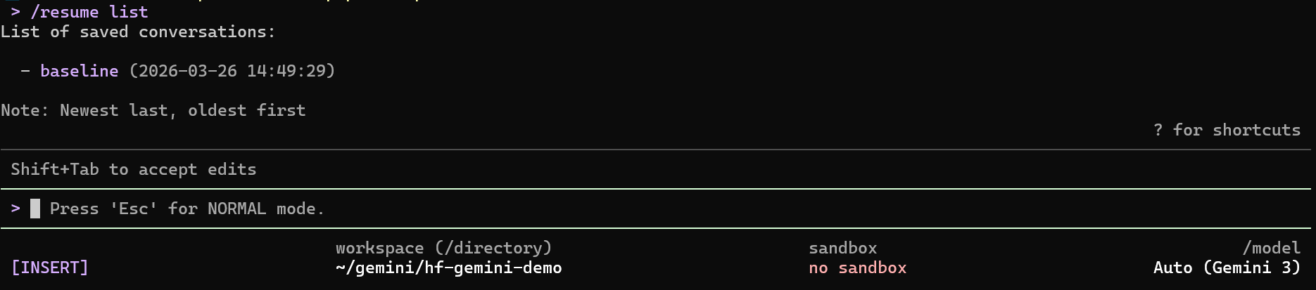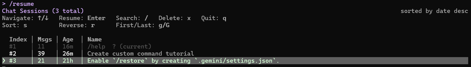 /resume단독은 auto-saved session browser임--resume옵션으로 gemini cli를 재시작할 때 이어서 할 session을 지정가능함.