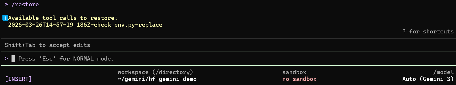 - Gemini-CLI가 파일을 수정하는 tool인 write_file, replace 등을 실행할 때마다 checkpoint가 자동으로 생성됨.