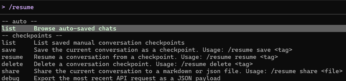 /resume save,/resume list,/resume resume은 manual conversaion checkpoint 관리/resume단독은 auto-saved session에 대한 session browser 를 연다.