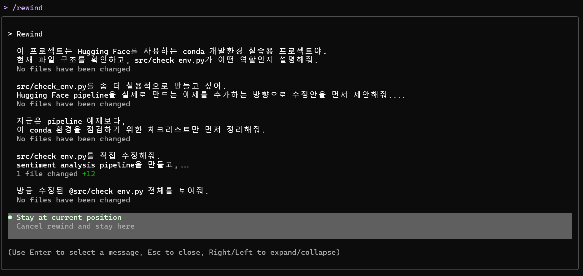 /rewind는 과거 interaction 목록을 보여 주고, 되감고 싶은 지점을 선택할 수 있음.- 그 뒤 "conversation만 되감기", "code changes만 되돌리기", "둘 다 되감기" 등을 선택 가능함