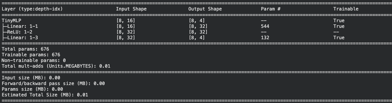 앞서 예제에서 확인했듯이torchinfo는 model 안에 들어 있는 nested module 구조를 펼쳐서 보여주는 기능을 제공함.