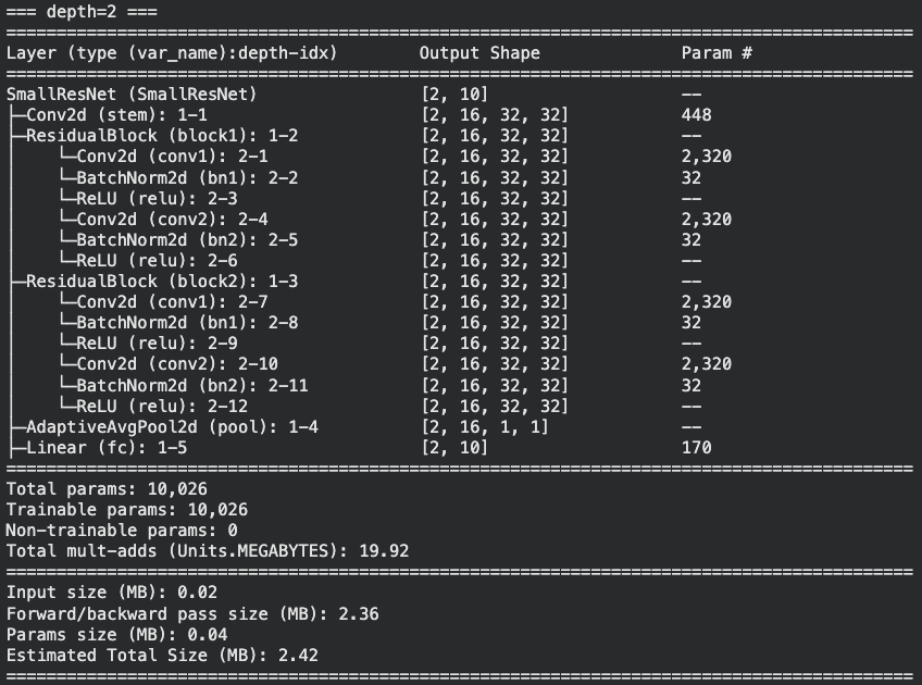 depth=1에서는stem,block1,block2,pool,fc같은 상위 module 위주로 보임depth=2에서는block1,block2내부의conv1,bn1,relu,conv2,bn2까지 펼쳐져 보임