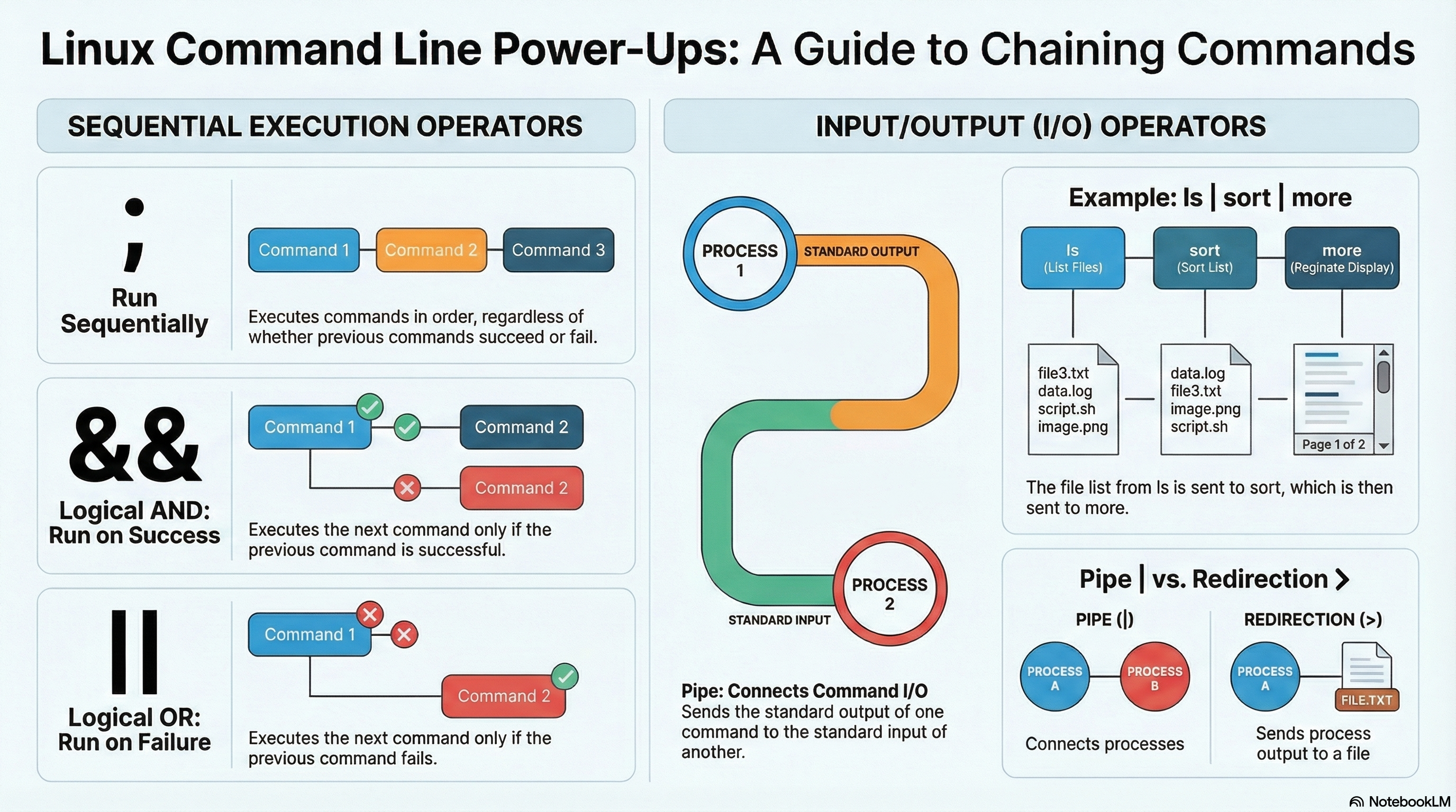 - 여러 commands를 한 line으로 기재할 수 있게 해주며, 앞에서부터 commands가 차례로 수행된다.